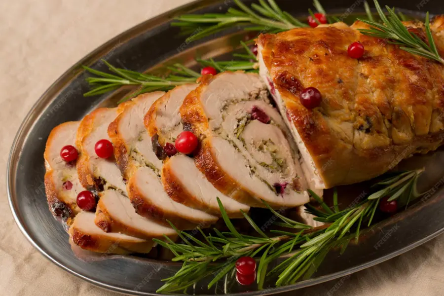 Ata el pollo con hilo de cocina para mantener la forma y evitar que el relleno se salga.